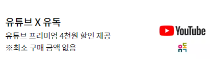 - 유튜브 프리미엄 4천원 할인 제공 (최소매 금액 없음)